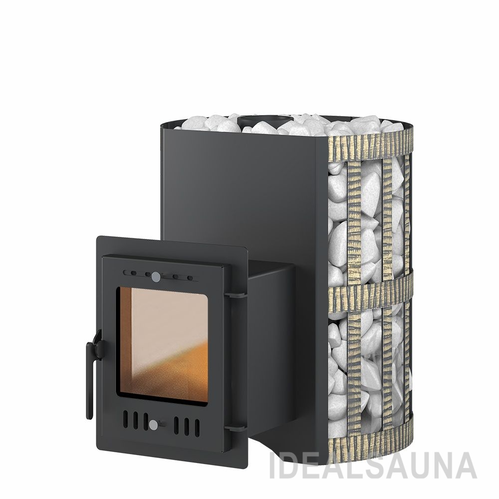 Широкая стальная панорамная дверь оборудована термостойким стеклом и выдерживает температуру до 650 градусов. В двери имеются системы верхней и нижней подачи воздуха. Нижняя подача обеспечивает правильное регулируемое горение дров в топке. С её помощью меняется интенсивность сжигания дров — закрывая заслонку, вы уменьшаете силу горения. Верхняя система подаёт воздух на стекло и таким образом отсекает дымовые газы от дверки. Так обеспечивается чистота стекла во время топки и отсутствие сажи на внутренних поверхностях дверки.