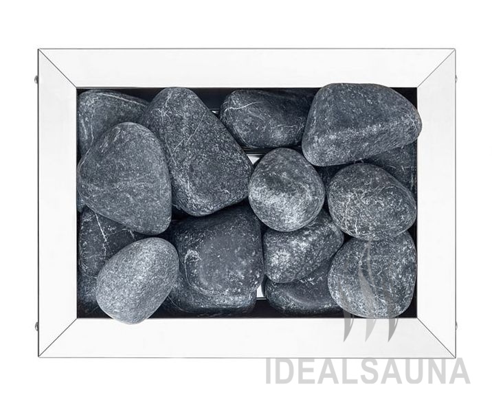 Представленная модель электрокаменки имеет отсек для камней, который вмещает до 80 кг. Она монтируется напольно.