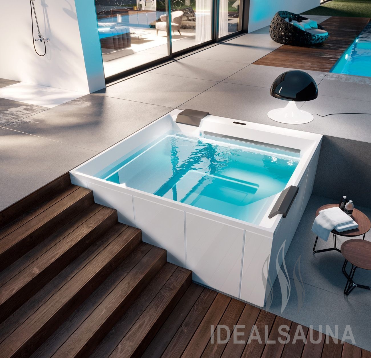 СПА бассейн для современных зон отдыха. Установка возможна как в уровень с полом, так и свободная. При свободной установке опционально доступны для заказа боковые панели из Crystaltech или дерева на выбор. Кроме того, мы стараемся максимально удовлетворить потребностям наших клиентов, и в случае, если для реализации дизайнерской мысли подходит ванна строго определенного цвета, мы покрасим ее по RAL в заводских условиях. Гидромассажные форсунки словно «спрятаны» в углублении и не привлекают внимание, позволяя воспринимать Спа бассейн Treesse Wave как цельное законченное произведение искусства с тонкими линиями и правильными формами.