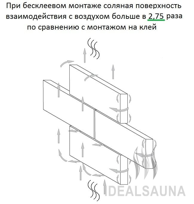 - соляная поверхность взаимодействия с воздухом больше в 2,7 раза по сравнению с монтажом на клей