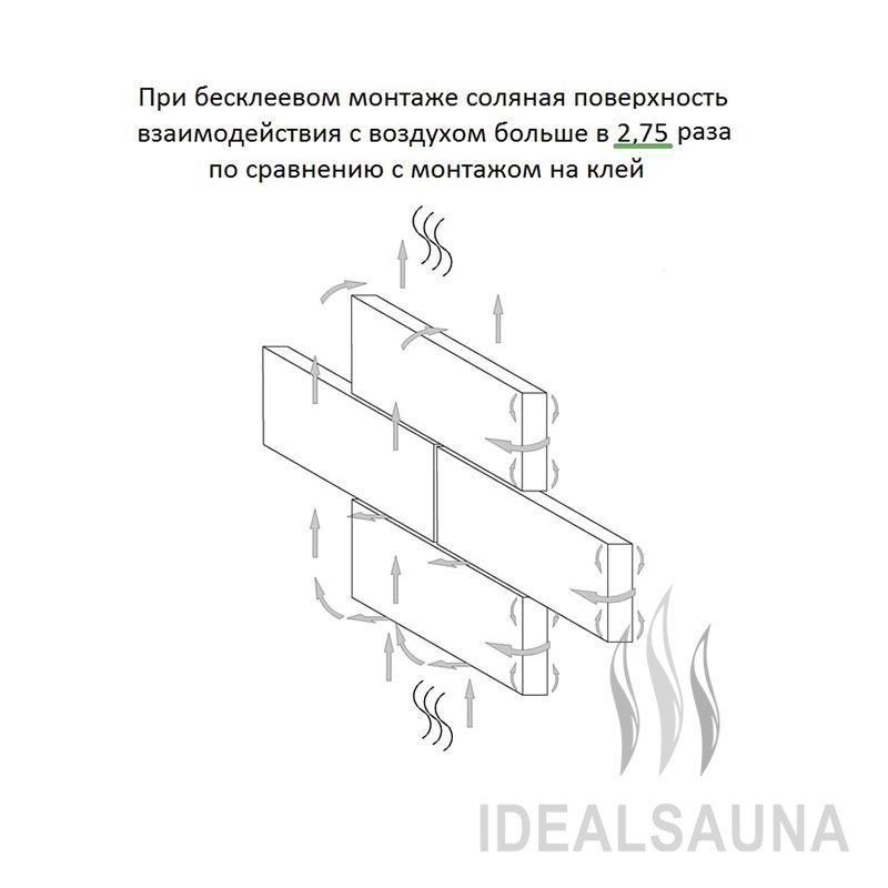 - соляная поверхность взаимодействия с воздухом больше в 2,7 раза по сравнению с монтажом на клей